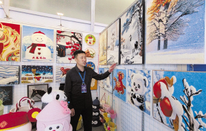 1月6日,在冰博会现场,黑龙江蓝艺地毯集团销售经理孙达鹏指着一批新作品介绍道:“这个系列的缠丝画是为冰雪季专门设计的产品,一条彩色丝线、几十个钉桩,能够千变万化缠绕出许多图案,大家都说这是‘带得走的冰城’。”