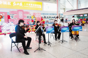 快闪活动现场乐声飘扬。 哈尔滨音乐厅供图 本报讯(记者 于秋莹)1月12日,哈尔滨太平国际机场人头涌动,来自世界各地的旅客带着冰城之旅的余温,在二楼C区行李托运与安检处有序穿梭。忽然,一阵清亮悠扬的小提琴声穿透人潮,瞬间吸引了所有人的目光——哈尔滨交响乐团雪人四重奏的艺术家们携弦乐雅韵现身机场,用一场别开生面的快闪演出,为旅客的归途画上浪漫注脚。