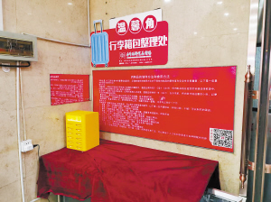 记者注意到,在奋斗副食门口,专门设置了一个“温馨角”。这是一个行李箱包整理处,特地为外地游客准备的。