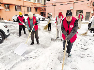志愿者在小区内清理冰雪。 本报记者 霍亮文/摄