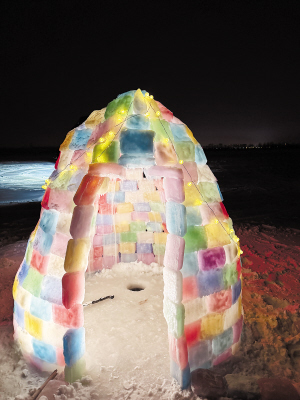 杨女士搭建的彩冰屋。 本报讯(记者 王铁军)近日,在呼兰区菜园子渔村江段冰面上,“长”出一间五彩缤纷的小冰屋。夜晚,彩灯透过冰砖,在白雪皑皑的天地间散开一片浪漫光晕。谁能想到,这间曾因搭建中途“翻车”的冰屋如今意外走红,被网友“云监工”和游客慕名打卡。更令人没想到的是,“网红冰屋”的建造者是一名身材纤细的女孩。