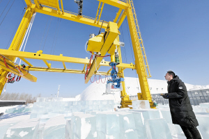 工作人员在操作冰雕搭建机器人。本报记者 刘洋摄 ■本报记者 李木双 王丹