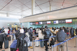 哈尔滨太平国际机场乘客排队值机。 本报讯(刘烨 记者 刘希阳)2月2日,哈尔滨太平国际机场共保障进出港航班546架次,进出港旅客8.6万人次。春运期间,各航空公司将加密航班、更换宽体客机,方便旅客出行。