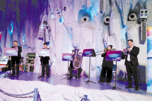 演出现场。 本报讯(记者 于秋莹)铜管乐声绕冰川,文旅融合贺新春。2月3日,哈尔滨音乐厅(哈尔滨交响乐团)室内乐团铜管五重奏走进哈尔滨极地公园,通过“高雅艺术进景区”系列演出为冰城春节文旅市场再添亮色。悠扬的铜管旋律与极地冰雪风光相映成趣,精彩演出轮番上演,市民游客在沉浸式艺术体验中感受新春的喜庆氛围,解锁“音乐之城”文旅融合的全新打开方式。