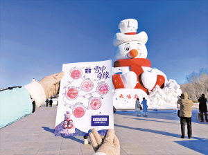 游客参加集章打卡活动。 本报讯(记者 李木双)日前,记者从第38届太阳岛雪博会获悉,本周雪博会推出四大免费活动,包括冰雪挑战赛、集章打卡、实景演艺、冬泳表演。市民游客可免费参与,一站式赏雪雕、玩互动、看演出,解锁冬日雪境欢乐。