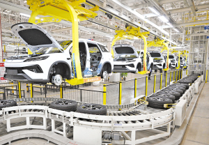 在郑州比亚迪总装工厂拍摄的新能源汽车生产线。新华社发