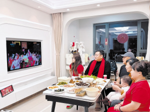 万家灯火与春晚旋律交相辉映,市民一家围坐一起,一边品尝年夜饭,一边收看春晚。 ■本报记者 孙莹