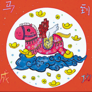 经纬小学顾可知的水彩画则更具奇幻色彩——粉色的卡通飞马踏祥云、驮元宝,金色的鬃毛与蓝色的背景交相辉映,四角“马到成功”的字样,将节日的喜庆与对未来的祝福浓缩于方寸画纸。