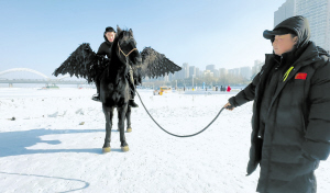 “飞马”踏雪。 本报讯(记者 毕博文/摄)新春佳节,松花江上再添网红新景——曾火爆“出圈”的黑“飞马”爱丽丝再度回归,亮相松花江冰雪嘉年华旁,为新春佳节的冰城增添一抹灵动。
