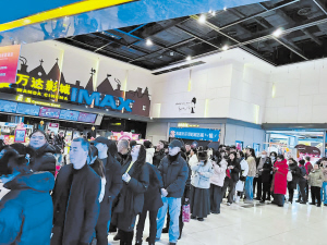 观众排队等待入场。 本报讯(记者 高云文/摄)2月17日,哈尔滨电影市场迎来火热开局。备受期待的6部大片同日首映,为市民游客奉上了一场年味十足的视听盛宴。截至2月17日下午,哈尔滨春节档票房(含预售)达762.24万元,其中喜剧强片《飞驰人生3》在本地表现出断崖式领先态势。
