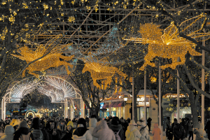 《冰雪飞马》取马年吉祥意象,灯光变换间定格飞马奔腾、振翅、颔首的灵动瞬间,寓意瑞马迎新、马到成功,为整条大街注入昂扬活力。