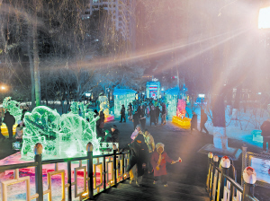 市民游客打卡冰灯艺术游园会。 本报讯(记者 阴祖峰文/摄)除夕,总台春晚哈尔滨分会场的惊艳亮相,让这座城市的冰雪之美通过荧屏传遍海内外。在第52届冰灯艺术游园会上,年味与冰韵交织成歌,成了市民游客寻找“春晚同款”冰雪浪漫的打卡地。