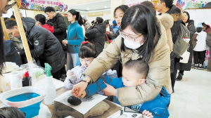 家长和孩子一起体验岩画拓印。 本报讯(陈彩玉 记者 封娇文/摄)2月18日,“天马行空”韩美林艺术体验市集在哈尔滨市博物馆火热启幕。随着五大艺术市集体验项目同步开启,现场气氛迅速升温,市民游客纷纷动手创作、拍照打卡,在亲身参与中真切体会可触摸、可创作、可带走的艺术之美。