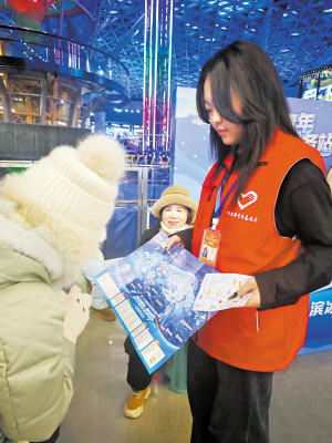 16时的哈尔滨冰雪大世界,冰砌的城堡沐浴在夕阳余晖与初上的华灯中,泛着梦幻般的光泽。园区内的冰城青年志愿服务站里,19岁的刘梓萱正耐心地为一位老人讲解冰雪项目的预约流程,她的指尖被冻得微红,但脸上始终挂着温暖的笑容——这是她岗前培训时牢记的重点:面对游客,笑容是最好的名片,要热情、有礼貌,让游客感受到哈尔滨的温暖。