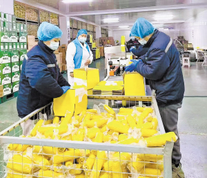 企业员工正在为产品装箱。 本报讯(记者 毕博文/摄)新春伊始,黑土地生机勃发。2月26日,在巴彦县嘉润农业开发有限公司仓储物流区内,一箱箱印有“巴彦玉米”国家地理标志的鲜食玉米礼盒整齐码放、整装待发。