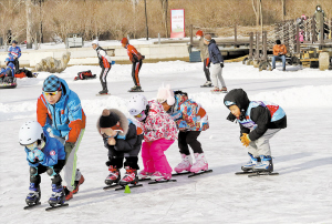春节假期,李贵明指导孩子们滑冰。 ■本报记者 韩伟文/摄
