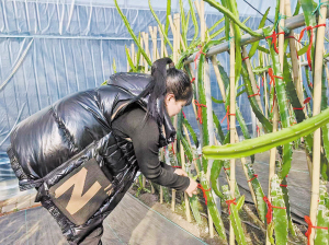 “火龙果对气温要求比较高,冬天时室温不能低于12℃,而且授粉时每天光照不能少于20小时。”张会君说。为此,工作人员在温室内不仅安放了“小太阳”来取暖,温室上方还挂了100多盏补光灯。“新品种果实白中带红,口感也好。”张会君说,因北方气候原因,一年只能结两茬果,继今年9月份首批采摘后,明年1月至2月可再结果采摘,“这样还填补了冬季地产新鲜水果的空白。”