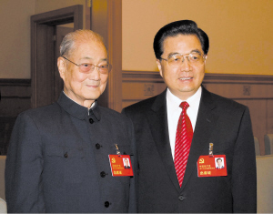 图③:2007年10月21日,在党的十七大闭幕前,胡锦涛同志同宋平同志在一起。 新华社发