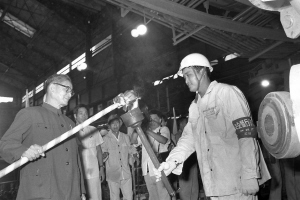 图④:一九八五年九月十五日,我国第一座日产万吨铁的高炉——宝钢一号高炉点火试生产。这是宋平同志(左一)为高炉点火。