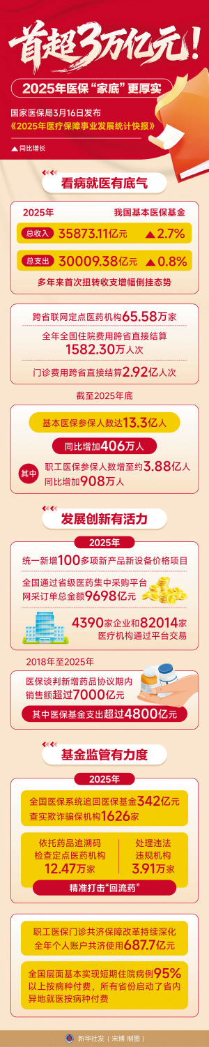 国家医保局3月16日发布《2025年医疗保障事业发展统计快报》,全民参保率巩固在95%,医保基金支出首次突破3万亿元。