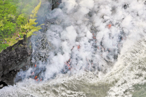 3月16日,在法属留尼汪岛圣罗斯,富尔奈斯火山释放出的岩浆流入大海,升起浓烟。