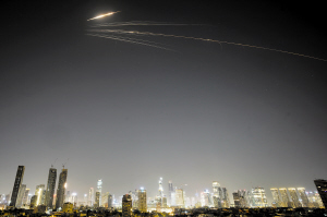 3月18日在以色列中部拍摄到的导弹划过天空的轨迹。