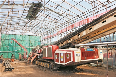 日前,记者在净水管线穿越机场高速施工现场看到,整个作业面近1000米长,施工方搭建暖棚作业,在拖管机的隆隆轰鸣声中,施工人员顶着春寒,监控设备运行,进行钻头焊接、钢管焊接等工作。