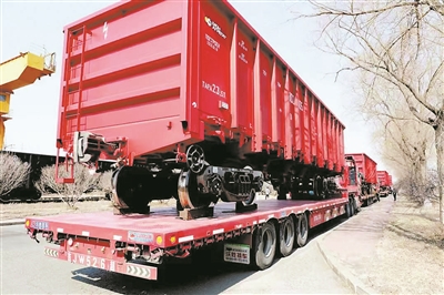 哈车公司为蒙古国制造的铁路货车完成装载、即将出发。 本报讯(记者 张鸣霄文/摄)近日,在中车哈尔滨公司配件分厂冲压厂房内,一辆辆色泽鲜艳的EC70D型底开门敞车铁路货车被装上运输车辆。由中车哈尔滨公司为蒙古国制造的铁路货车总计60辆,将分三批次发往二连浩特,从那里驶出国门交付蒙古国客户。