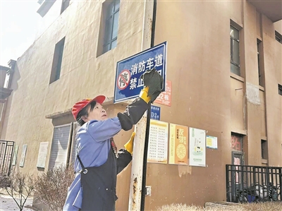 物业员工擦拭小区标识牌。 本报讯(记者 刘述波文/摄)近日,为落实全市春季环境整治工作部署,打造整洁宜居的居住环境,冰城多家物业企业同步开展春季环境整治专项行动,用扎实的行动为居民扫清冬日痕迹,迎接春暖花开。