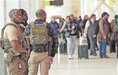 3月23日,移民与海关执法局的执法人员在美国纽约拉瓜迪亚机场的出发安检处执勤。
