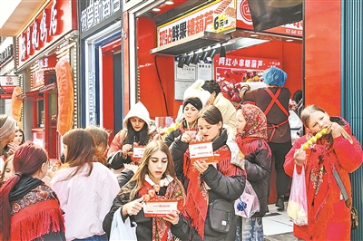 外国游客打卡哈尔滨美食。 “哈报手机记者” 门奎摄。 ■本报记者 李佳琪