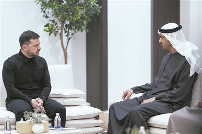3月28日,阿联酋总统穆罕默德(右)在阿布扎比会见到访的乌克兰总统泽连斯基。新华社发 据新华社北京3月30日电 乌克兰总统泽连斯基29日访问约旦,会见约旦国王阿卜杜拉二世,讨论防务合作。据多家媒体报道,泽连斯基此前已访问沙特阿拉伯、阿联酋和卡塔尔,意在向这些国家“推销”乌克兰“经过实战检验、更具性价比的反无人机技术”。