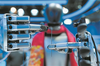 在中关村展示中心常设展上,一台配备了灵巧手的机器人在展示穿针引线。 新华社发