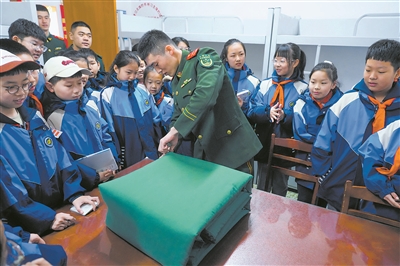 武警官兵展示叠被子。 本报讯(刘炳海 张同根 张宇 马晟林 记者 杜菲菲)清明节来临之际,武警黑龙江总队某部官兵与哈尔滨市继红小学的师生联合开展清明祭英烈系列主题活动,“橄榄绿”牵手“红领巾”,共同表达对英烈的深切缅怀。