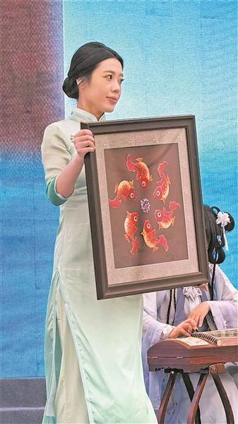 李宝霞接受采访时表示,《鱼戏丁香图》以仰韶文化三鱼纹彩陶盆经典元素为背景,将千年史前文化与松花江开江民俗巧妙联结,六条红金锦鲤灵动鲜活,呈环形环绕之势,栩栩如生地展现出锦鲤跃水的灵动姿态,象征着开江后松花江渔业兴旺,百姓全年福泽绵长。画面正中,一朵精致的五瓣丁香成为点睛之笔,既契合哈尔滨市花的地域特质,又以“五瓣”寓意五福临门,将地域文化与美好祝愿融为一体,尽显巧思。