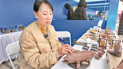 “这是鳌花,松花江流域的代表性鱼类,肉质鲜嫩,还是蒜瓣肉。”活动现场,徐晶手中的紫砂泥在指尖流转,一条栩栩如生的鳌花鱼雏形渐显。作为蒋蓉大师第二代弟子,徐晶深耕紫砂雕塑艺术多年,此次她创新性地采用“南泥北做”的手法,将宜兴紫砂泥与黑龙江地域文化深度融合,现场打造鳌花、鳊花、鲫花“三花鱼”雕塑,成为开江节非遗展区的一大亮点。徐晶将松花江“三花鱼”这一黑龙江特色符号融入紫砂创作,用指尖技艺勾勒北方水域的鲜活生命力。