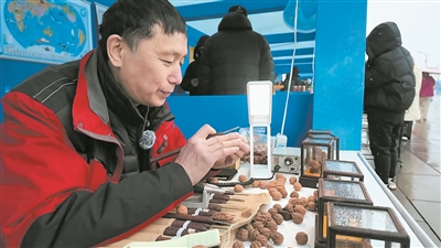 杨富长进行雕刻创造。 本报讯(记者 王铁军文/摄)渔翁垂钓、鸬鹚捕鱼、江舟泛波,松花江的渔猎风情跃然“核”上。一枚东北秋果核桃,最薄处不及毫米,却能在指尖上雕出松花江畔的“渔舟唱晚”。在2026哈尔滨开江文化周活动现场,省级非遗雕刻秋果核桃技艺代表性传承人杨富长,以刀为笔、以核为卷,将开江渔猎文化浓缩于不足1平方厘米大的核面之上,让非遗与冰城民俗相映成趣。