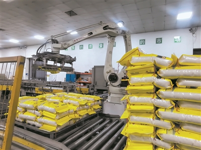 走进五常市五米常香农业科技发展股份有限公司的生产车间,记者最直观的感受是“快节奏”。只见巨大的机械手精准地将一袋袋刚下线的大米抓取封包、码成垛位;车间外,叉车往来穿梭,将一垛垛大米装入等待已久的大型货车中。
