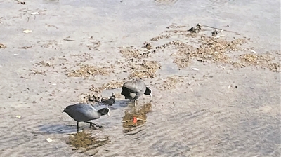 白骨顶鸡在湖面觅食。 本报讯(记者 周辰文/摄)冰消雪融,春水回暖。4月14日,记者走访体育公园发现,公园人工湖上往年的“老房客”已准时赴约,白骨顶鸡一家、绿头鸭小队结伴归来,在湖面上嬉戏觅食,为初春的公园增添了灵动的生态景致。
