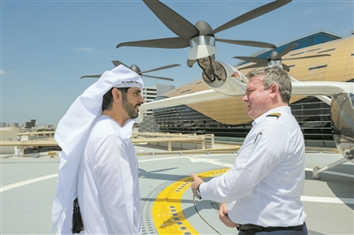 在阿联酋迪拜,工作人员向迪拜王储谢赫哈姆丹·阿勒马克图姆(左)介绍空中出租车垂直起降场。新华社发