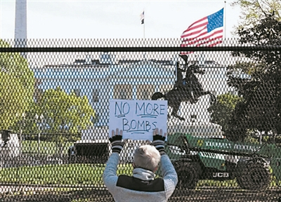 4月7日,一名示威者在美国首都华盛顿的白宫前手举标语。