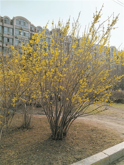路边盛开的东北连翘。 本报讯(记者 封娇文/摄)“鹅黄新染旧篱笆,独自先春,几簇明花。”春雨过后,哈尔滨的街角、路边、小区院内,一抹抹黄色悄然探出头来。作为“报春使者”,东北连翘在冰城次第绽放,用满枝鲜亮的色彩迎接春天的到来。