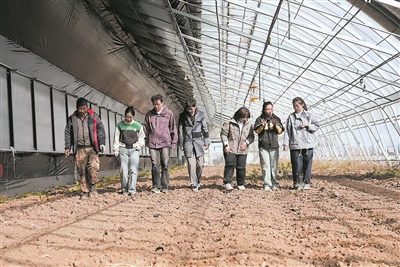研发团队和农户一起踏查棚室情况。 ■徐婧雯 本报记者 王越