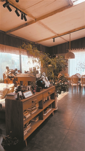 咖啡馆所用房屋是其丈夫祖传老宅。从2022年开始,夫妻二人亲手设计施工,历时两年多,打造出上下两层600多平方米的特色乡村空间。店内主打自然原木风,绿植环绕、简单质朴。