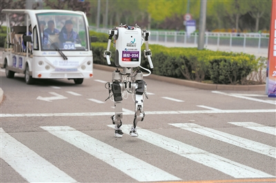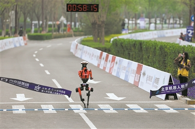 4月19日,齐天大圣队自主人形机器人选手闪电在比赛中冲线。