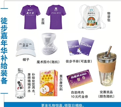 专属补给包:内含惠尔康苹果汁、百变魔术围巾、实用代金券、徒步大赛手册,贴心配齐全程所需,轻松参与无负担;