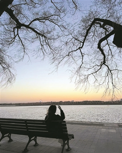 较早把这里拍成短视频的是一名在哈尔滨读大学的郑州女孩。那天傍晚,老柳树枝条垂着,远处江水铺展,晚霞烧成一片。她坐在那儿,觉得特别有氛围感,就拍了一张片做成视频,配了一句“我在这棵树下等一个人”。