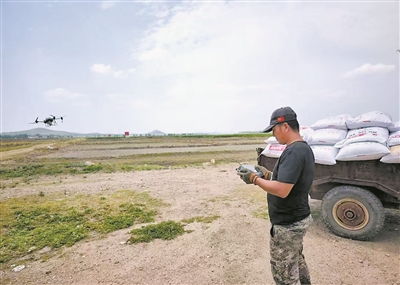 无人机起飞播种。 本报讯(记者 罗彦坤 毕博文/摄)春耕时节,木兰县建国乡的一片稻田里,阵阵旋翼轰鸣声划破山野宁静。一架搭载定量播种系统的农业无人机腾空而起,80斤稻种均匀“空投”至泡好的田块,4分钟返航完成5亩地播种,精准度控制在厘米级。这是“新农人”袁秋野的日常作业场景。