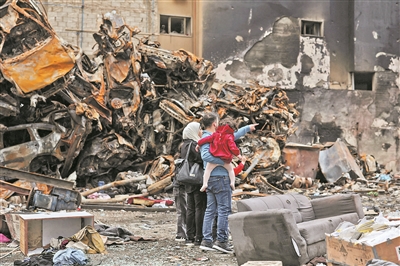 4月19日,在黎巴嫩贝鲁特,一家人查看4月8日遭以军袭击的建筑。新华社发