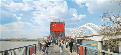 “站在桥上看着一面面国旗,深切感受到这座城市的历史厚重。”从福建来哈旅游的黄先生站在主题铁艺造型旁边说。他参观了档案文献展和红色地标,了解哈尔滨作为“全国解放最早的大城市”的那段历史。“80年了,哈尔滨从过去走到今天,变化太大了。祝愿冰城越来越好。”